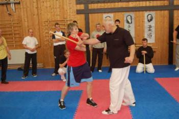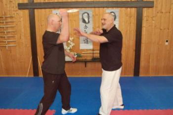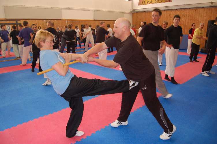 Sie stehen sich abwartend und lauernd gegenüber. Der eine schwingt unablässig den Stock. Der andere verfolgt mit innerer Anspannung die aggressiven Bewegungen des Gegners. Dann saust der Arm mit dem Stock in Richtung des Gegenüber. Dieser blockt präzise mit beiden Händen den Arm des Gegners. Dazu noch eine blitzschnelle Handbewegung, verbunden mit einer rasanten Drehung, der Angegriffene hat den Stock in seinen Händen. Der Angreifer liegt derweil am Boden.