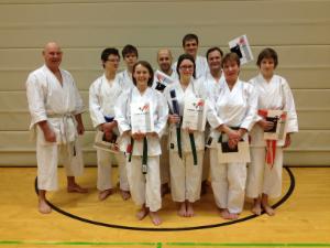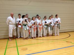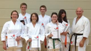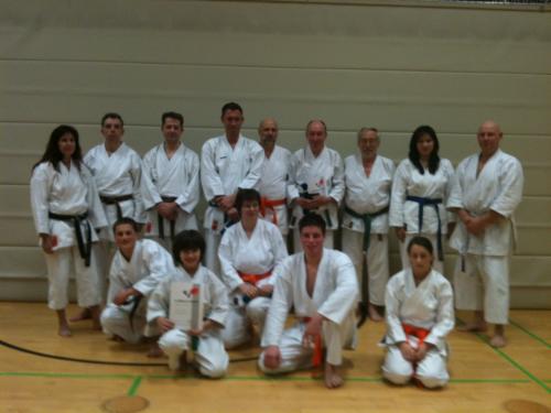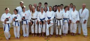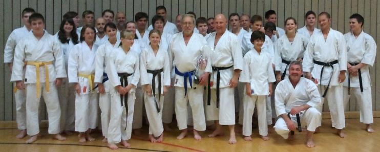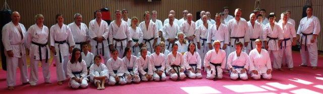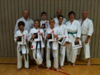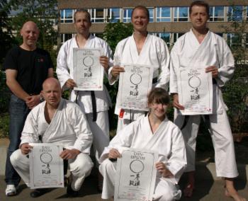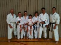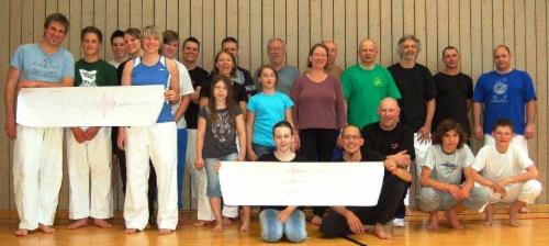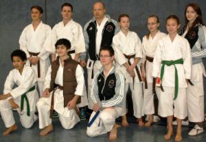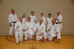 Hintere Reihe v.l. Claudia Thieser (Trainerin), Willi Mertes 2 Kyu, Lutz Schmidt 1 Kyu, Michael Habermann 5 Kyu, Jörg Jeremias 6 Kyu, Andreas Tombrink 5 Kyu, Erwin Weber 5 Kyu, Anna Kikoak 4 Kyu, Hardy Berscheid (Prüfer) Davor kniend Til Dietrich 2 Kyu, Yannick Drescher 5 Kyu, Simone Wagener-Kikoak 6 Kyu, Stefan Kurtenbach 6 Kyu, Maike Jeremias 6 Kyu.