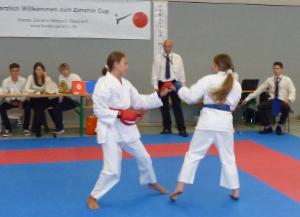 Schlagkräftiger Auftakt zum 14. Zanshin-Cup durch Jill Ruckenstuhl (13 Jahre) und Ann Schulte-Bunert (12 Jahre) in der Sporthalle am Diakonissenweg in Moitzfeld.