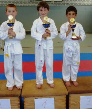 Die Sieger bei den „Bonsais“ in der Altersgruppe 7 bis 8 Jahre (v.l.) Philip Neuhäuser (2. Platz), Finn Reinhardt (1. Platz), Fabian Wehn (3. Platz). Foto: Karate-Zanshin