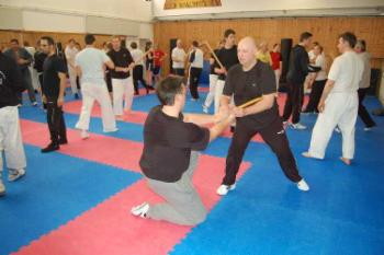Dieses Szenario kann tagtäglich irgendwo passieren. Deshalb haben zwei Karate-Vereine aus Waldbröl und Bergisch Gladbach einen SV-Lehrgang mit der Thematik „Abwehr von Angriffen mit dem Messer und dem Stock“ ausgeschrieben und dazu den Lehrbeauftragten für Selbstverteidigung und –Selbstbehauptung im Deutschen Karate Verband (DKV), Werner Dietrich, 2. Dan, verpflichtet. Der 50-Jährige ist Kriminalist, lehrt und praktiziert seit mehr als 38 Jahren die Kunst der Selbstverteidigung. Seit 25 Jahren bildet er auf diesem Spezialgebiet Polizeibeamte in Baden-Württemberg aus. Im privaten Bereich ist er 2. Vorsitzender des Bruchsaler Budo-Clubs. „Ein Mann vom Fach“ praktiziert Selbstverteidigung auf hohem Niveau im Kreise von Karate-Profis und sorgt durch seine differenzierten Techniken bei Angriff und Verteidigung manchmal für ein gewisses Staunen innerhalb der weiblichen und männlichen Teilnehmerschar.