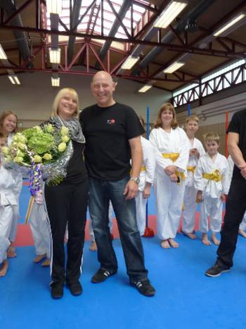 15 Jahre Karateverein Karate-Zanshin Bergisch Gladbach e.V. wurde in Verbindung mit dem „Cup“ verdeutlicht. Für den Vereinsgründer Hardy Berscheid und „Noch-immer-Vorsitzender“ eine lange, aber erfolgreiche Zeit. Gleichfalls auch für seine Ehefrau Angelika, die im Verein ebenso stark engagiert ist. Beide erhielten für ihre Verdienste um den Verein Blumen und Geschenke von Schriftführer Michael Laudenberg im Namen aller Mitglieder überreicht. Die Überraschung für die beiden Leistungsträger war gelungen.