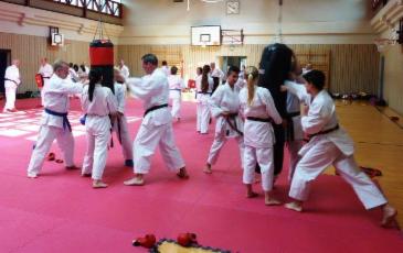 Moitzfeld. Der für Juli 2013 ausgeschriebene Selbstverteidigungs-Lehrgang (SV-Lehrgang) des Karatevereines Karate-Zanshin Bergisch Gladbach e.V. war mit 44 Teilnehmern kurzerhand belegt. Das Interesse war so groß, dass einige Karatekas nur als Zuschauer dem Geschehen folgen konnten. Dieser von Hardy Berscheid, 5. Dan und Karate-Lehrer, ausgeschriebene SV-Lehrgang erfolgte mit fachlicher Unterstützung von Michael Pottgiesser, 3. Dan, Mitglied im Karate-Club Waldbröl. Pottgiesser unterrichtet dort Karatekas auf seinem Spezialgebiet der Selbstverteidigung. Die beiden SV-Spezialisten ließen schon in der Ausschreibung keinen Zweifel daran, die Thematik Selbstverteidigung mit versierten Karatekas aktiv gestalten zu wollen. So war gleich zu Beginn des SV-Lehrganges in der Sporthalle der Friedrich-Fröbel-Schule klar, an einem hochgradig ausgerichteten Lehrgang teilzunehmen. Berscheid und Pottgiesser legten die Messlatte sehr hoch, erklärten Verteidigungsstrategien und die einhergehenden Angriffskomponenten deutlich und zeigten diese wirkungsvoll auf. Die Teilnehmer nutzten die Beispieltechnik und versuchten, die vorgegebenen SV-Segmente zu verinnerlichen. Es wäre falsch berichtet, würde man behaupten, die Teilnehmer hätten die Vorgaben problemlos und ohne Schweißperlen auf der Stirn bewältigt. Beim anschließenden Circuit-Training wiesen einzelne Stationen Boxsäcke, Arm- und Handpratzen sowie Boxsack-Ständer auf. Die SV-Trainer Pottgiesser und Berscheid, die als Multiplikatoren in der Sparte Selbstverteidigung im Deutschen Karate Verein gelten, wollten bewusst Stress bei den Teilnehmern erzeugen und diese bis an den Rand der Erschöpfung führen. Das Fazit der Teilnehmer bezüglich der SV-Übungen war sehr positiv; die seien sehr anstrengend, lehrreich und enorm schweißtreibend gewesen.