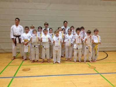 Gruppenfoto: 20 junge Karatekas haben einen weiteren Kyu-Grad erlangt.