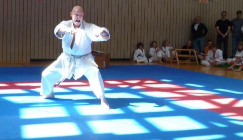 Von nun an folgten im Gleichklang zügige Bewegungen. Die Fuß-, Schlag- und Tritttechniken waren sorgfältig angepasst. Ein Rascheln, verursacht durch die weißen Anzüge, war deutlich zu hören. Ansonsten herrschte gespannte Ruhe. Was hier offenkundig wurde, war eine Vorführung in Sachen perfekter Karatekunst. Für die Fachkundigen aus den Karatevereinen Bonn, Bergisch Gladbach, Köln, Königsdorf, Aachen und Waldbröl galt, Präzision, Geschwindigkeit, Ausdauer und Kraft weiter zu vervollkommnen. Das Gesamtbild der Teilnehmer war geprägt von dem Eindruck einer Gleichmäßigkeit bei Übungen und Bewegungen, wo teilweise die Kraftanstrengungen mehr als deutlich zu sehen waren. Nicht zu vergessen: Die Akteure im Alter von sechs bis 75 Jahren beeindruckten durch eine ausgezeichnete Kondition und Standfestigkeit. Georg Karras (53), der über sechs Stunden die primäre Leitung bei den Vorführungen hatte, glänzte durch seine Kenntnisse und man konnte ihm auch nach längerer Zeit keinerlei Anstrengungen anmerken. Er selber verwies auf seine 37 Jahre engagiertes Karate-Training in Bonn, wo er in seinem Karateverein mit 160 Mitgliedern um die 15 Stunden pro Woche mit Trainingseinheiten gebunden sei. Es scheine in der Familie zu liegen, so ließ Karras verlauten, denn Ehefrau Martina habe in dieser Sportart den 3. Dan erzielt und die beiden Söhne erfreuten sich des 1. und 2. Dan. Karras gelte in NRW als professioneller Karateka-Lehrer, der bei der Durchführung von Lehrgängen für Leistungsträger hohes Ansehen genieße und besonders gefragt sei. Seine Demonstration im „Dreier-Pack“ erweckte ungeteilte Aufmerksamkeit. Das Szenario sah einen Verteidiger vor, der von zwei Angreifern attackiert wurde. Die gezeigte Verteidigungsstrategie war beeindruckend – die Akteure verinnerlichten die technischen Abläufe und präzisierten die eigenen Abwehrtechniken mit hinreißendem Engagement.