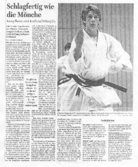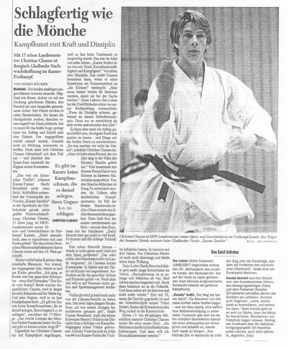 Bergisch Gladbach. Nicolas Deuß war der Star beim „Zanshin Cup 2002“ in der Sporthalle der Fröbelschule in Moitzfeld. Im Karateverein Zanshin Bergisch Gladbach e.V. ist er nun erstmals in den Disziplinen Kata (festgelegte Bewegungen) und Kumite (Freikampf) Doppelsieger geworden. Zwei weitere erste Plätze erzielten Sabrina Droven und Johanna Frassek in der Disziplin Kata. Den Techniker-Preis erkämpfte sich Kristina Wichert. Teilgenommen haben 30 Jungen und Mädchen im Alter von acht bis 13 Jahren. Jeweils drei „erprobte“ Kampfrichter ließen keinerlei Zweifel an den gefällten Entscheidungen pro oder contra der Wettkämpfer/innen aufkommen. Die fachliche Leitung oblag dem Vereinsvorsitzenden und Karatelehrer Hardy Berscheid, 3. Dan Schwarzgurt.