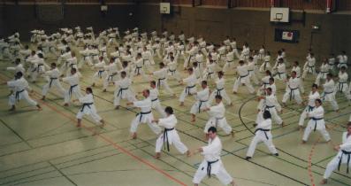 Vertreten waren die Altersklassen von acht Jahren bis zum 64jährigen Schwarzgurt-Kämpfer. Bundestrainer Karamitsos, der 1975 während seines Studiums mit dem asiatischen Karate-Sport begann, verwies auf unterschiedliche Techniken, zeigte stil- und kraftvoll ausgeführte Schläge mit der Hand, der Faust, den Füßen und demonstrierte blitzartige Bewegungsabläufe mit ausgefeilter Präzision. Bei der Wiederholung dieser Übungen durch die Sportler hörte man oft nur das kurzzeitige einheitliche Rascheln des Stoffes, das Aufklatschen der Füße auf dem Fußboden und der einheitliche Aufschrei bei der Anspannung aller Muskeln. Zwecks der Korrektur lief der „Meister“ durch die Reihen und zeigte in gewohnt entspannter Manier Verbesserungsvorschläge auf. Denn nach den Worten des Bundestrainers ist „Karate die Philosophie in der Bewegung“. Ohne Zweifel, die Lehrgangsteilnehmer blickten zu ihrem „Karate – Guru“ auf, der ein extrem starkes Durchhaltevermögen bewies, und alle akzeptierten die differenzierten Präsentationen. Bei den zwischendurch geführten „technischen“ Diskussion saßen die Sportler dem Bundestrainer zu Füßen; danach folgten temperament- und kraftvolle Einzelübungen, und man merkte sofort, dass Diplomtrainer Karamitsos, Träger des fünften Dans, keinerlei Lässigkeit in den Bewegungsabläufen zuließ.