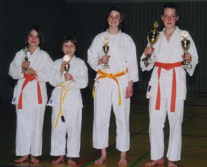 Die Vereinsmeister des "Cup 2002": Kristina Wichert (Techniker-Preis); Sabrina Drouven, 1. Platz Kata-Unterstufe; Johanna Frassek, 1. Platz Kata-Mittelstufe; Doppelsieger Nicolas Deuß, 1. Platz in Kata und Kumite-Oberstufe (v.l.n.r.)